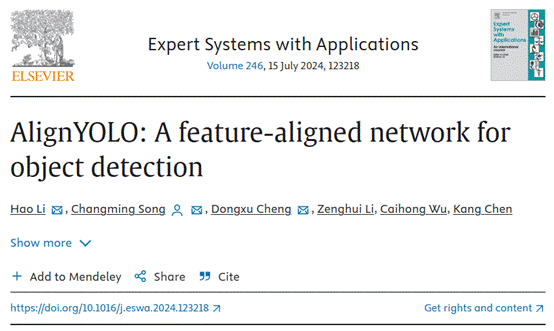 2021级研究生李灏以第一作者在《Expert Systems With Applications》期刊上发表题目为“AlignYOLO: A feature-aligned network for object detection”的研究成果(论文链接:doi.org/10.1016/j.eswa.2024.123218)。论文通讯作者为研究生指导教师宋长明教授。《Expert Systems With Applications》是人工智能、运筹学等领域国际顶级期刊,期刊当前影响因子为8.5,属于中科院SCI期刊大类分区1区TOP期刊,在全球具有强大的学术影响力。