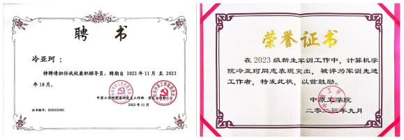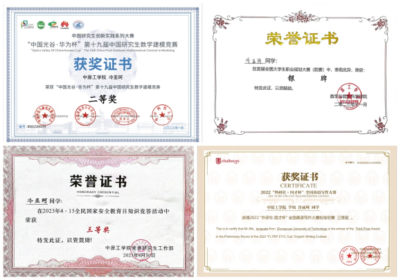 通过不懈努力,硕士学位课程平均90分,硕士非学位课程平均91分,以全年级第一的成绩获2022-2023学年河南省研究生学业一等奖学金、中国研究生数学建模竞赛国家级二等奖、首届全国大学生职业规划大赛校级银奖、“外研社 国才杯”全国英语写作大赛校级三等奖等。