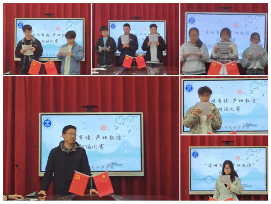 举行“清明寄情 声动数信”主题朗诵比赛。学院党总支副书记杨向宇、学工办主任陈婷、教学办主任于洋、团委副书记张瑞楠担任评委,低年级学生代表参加比赛。