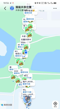 本次活动共计60余名来自不同学院的学生参与,以“猫鼠追逐”的形式,利用高德地图的位置共享功能,将传统躲猫猫游戏融入现实场景,为参加游戏的同学们带来了全新的游戏体验。